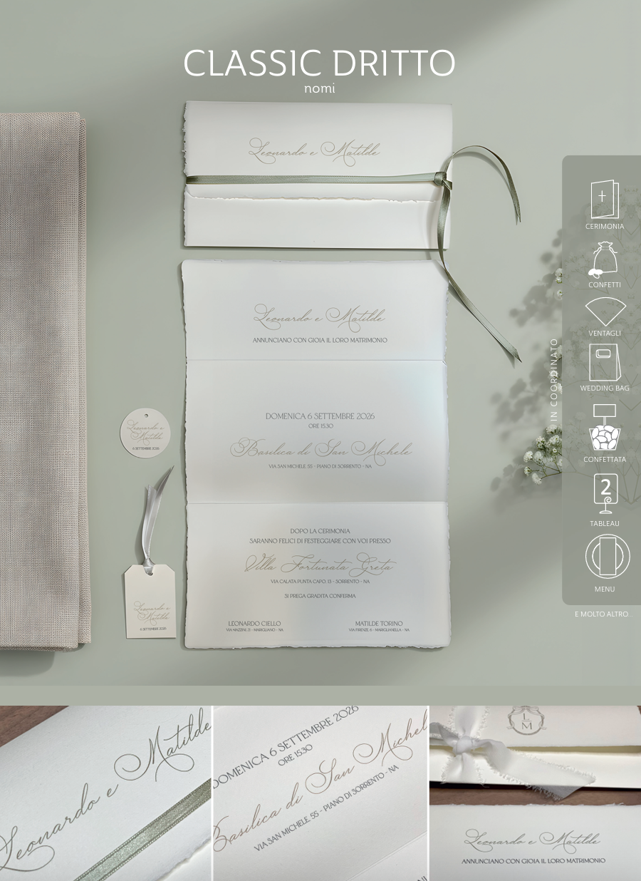 Partecipazione "Classic Dritto Nomi". Partecipazione in carta Amalfi rettangolare, stampa fronte e retro. Colore Avorio. Nastro in doppio raso colore a scelta. Cliché di stampa escluso. Disponibile anche il coordinato cartaceo. Il prezzo indicato è valido per una quantità superiore ai 50 pz. Per info, preventivi e ordini 3911883686 (Anche whatsapp).