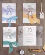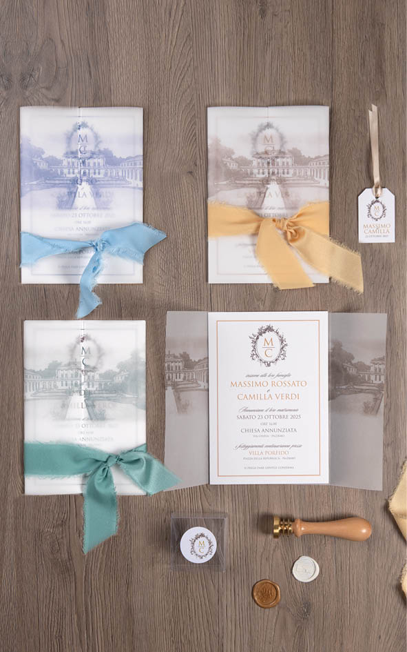 Partecipazione in carta Gesso con velina location. Il costo della partecipazione si riferisce al modello in foto. Cartoncino partecipazione + velina + nastro in seta oro.