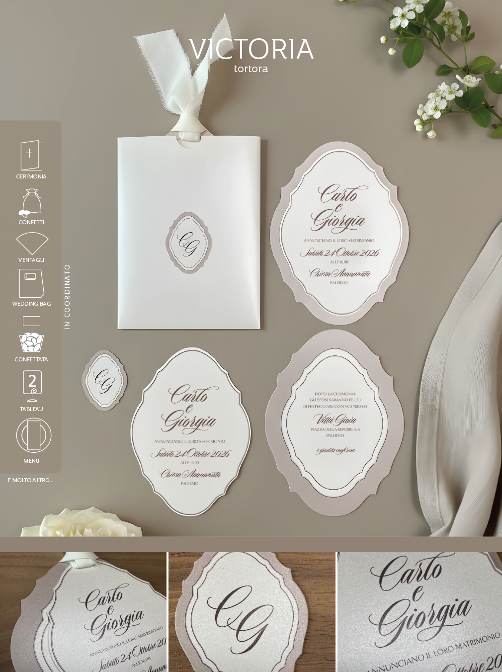 Partecipazione sagomata in carta perlata avorio o bianca e nastro in seta "Victoria Tortora". Busta esterna con tag sagomato incollato disponibile in - PERLATA AVORIO - PERLATA BIANCA - PERLATA TORTORA. Nastro in seta sfrangiato colori disponibili: - ORO - CIPRIA - AZZURRO - OTTANIO - BIANCO. Il costo della partecipazione si riferisce al modello in foto già confezionata con busta + card sagomata cerimonia e ricevimento + nastro a scelta. Aggiunta seconda card + 1 euro. Cliché di stampa escluso. Disponibile anche il coordinato cartaceo. Il prezzo indicato è valido per una quantità superiore ai 50 pz. Per info, preventivi e ordini 3911883686 (Anche whatsapp).