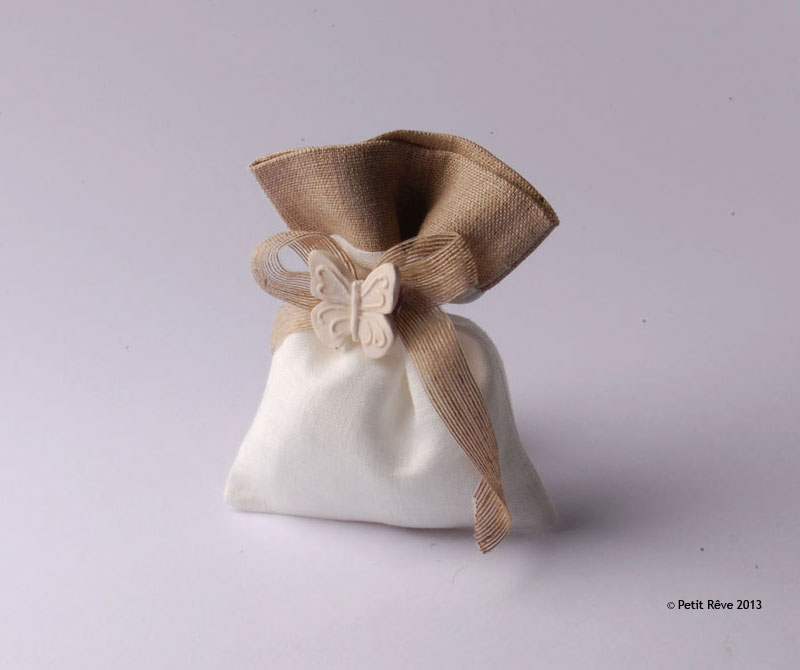 Sacchetto in lino bicolor con nastro in lino, decorazione farfalla in gesso profumato "Mathilde M.", linea "Cannes", 5 confetti multigusto marca "Papa - Dolceamaro".